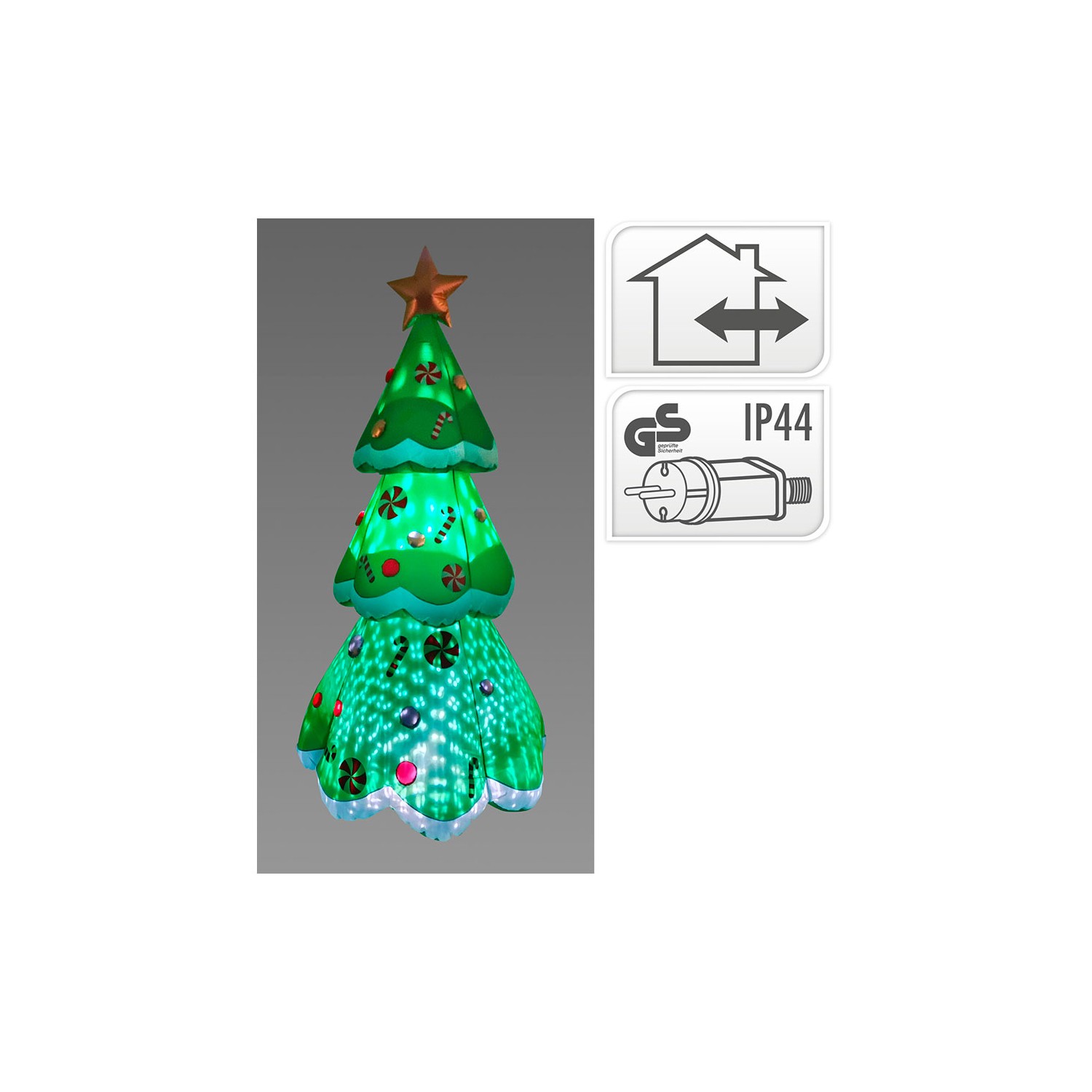 Arbol de navidad hinchable, con iluminación led 12v dc 1,0a, para exterior. con adaptador y ventilador. material poliéster / polipropileno. cable 2 m. contiene 3 estacas y 3 cuerdas para poder fijarlo. dimensiones: cuerdas 220 x 200 x 270 mm