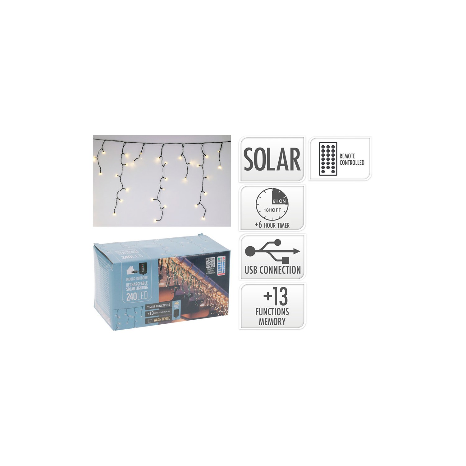 Guirnalda solar recargable, 240 led blanco cálido. ip44, panel solar 24v 230 mha. 13 funciones y función de temporizador. se puede cargar por cable usb (incluido). batería recargable no reemplazable li-ron 3,7v. cable 3 m, longitud total 5,6 m. mando a distancia bateria cr2025 (incluido). carga 6 h aprox, tiempo de iluminación 40 h. 53 cadenas, distancia entre cadenas 15 cm