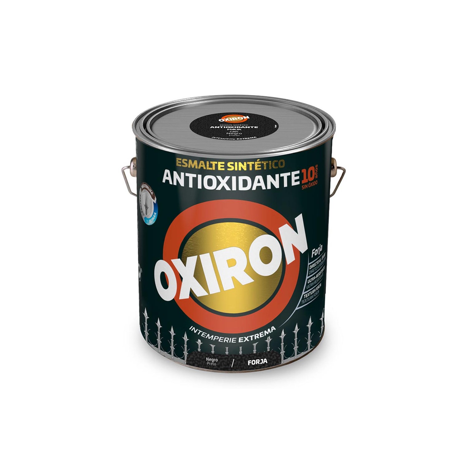 Esmalte sintético metálico antioxidante negro forja 250 ml de altos sólidos, de gran adherencia, elasticidad y resistencia a la intemperie, de aplicación directa sobre acero y óxido sin necesidad de preparación previa. excelente protección y decoración de cualquier superficie de hierro, a las que confiere un acabado metálico natural tipo forja. excelente aplicación a brocha y rodillo, amplio tiempo abierto, que facilita los retoques. colores entremezclables y altamente sólidos a la luz