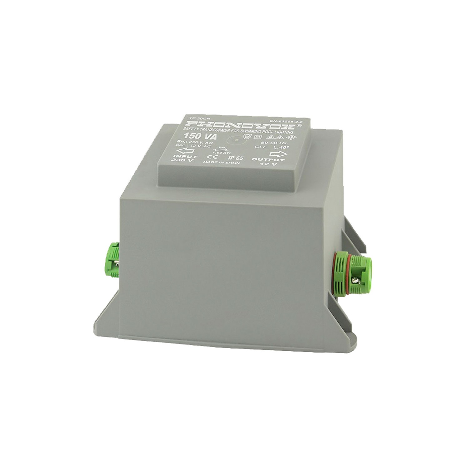 Transformador pool 150va 230/12v 50-60hz ip-65 conexión externa - cr tp30103cr phonovox transformador de seguridad para alimentación de focos subacuáticos de 12vac ( piscinas). potencia nominal 150va, carga de hasta 105w de focos led ó 150w de focos incandescentes. carcasa plástica de poliamida, encapsulado en resina de poliuretano, clase ii, norma iec61558, prensaestopas, cuerpo aislante y juntas ( 2 juegos), protector térmico, indice de protección ip-65. uso exterior. peso unitario: 3,10kg. medidas: 129x72x99mm