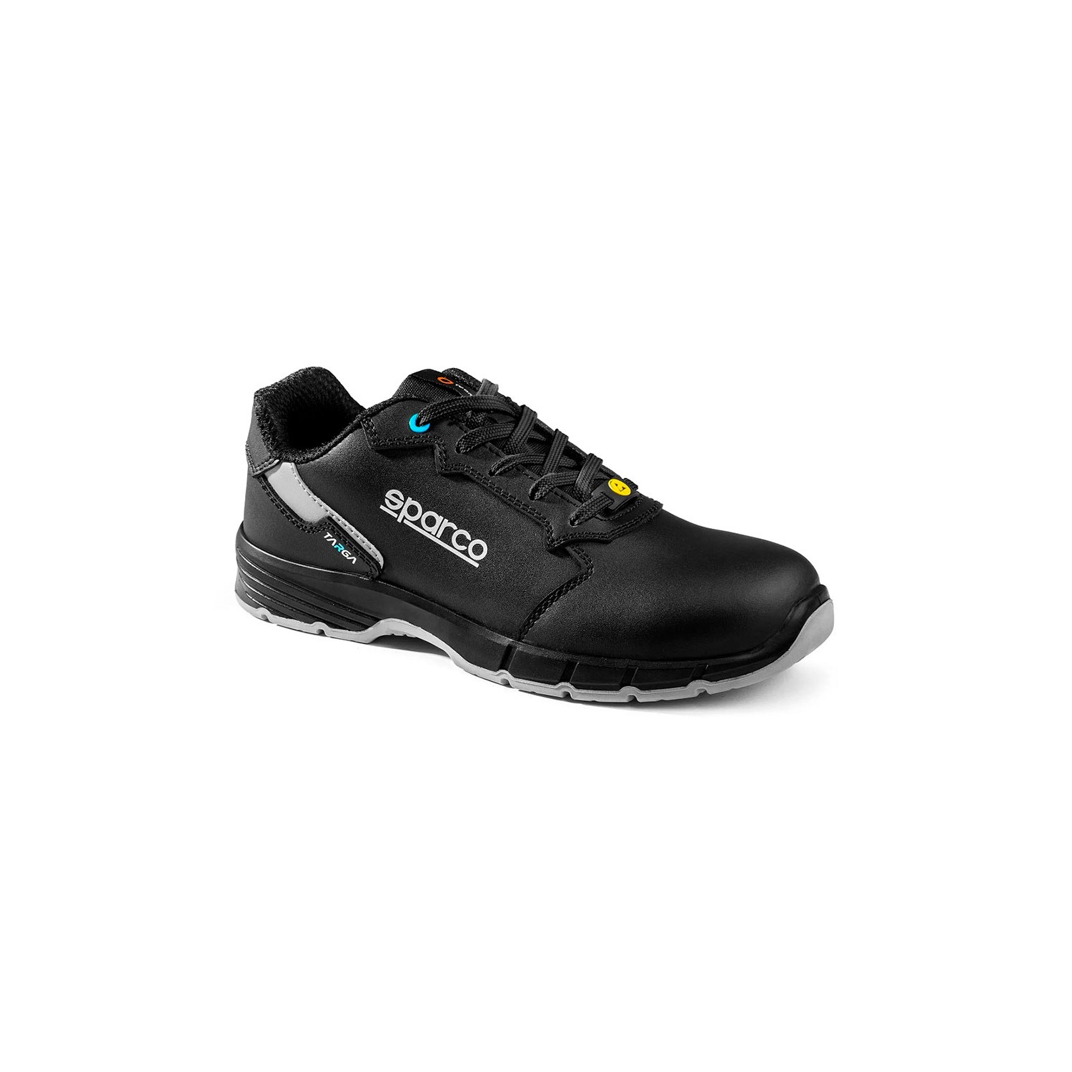 Zapato deportivo de seguridad targa sandro, negro, talla 45. certificación en iso 20345:2022 esd s3s sr fo. repelente al agua, suela pu doble densidad. tejido 3d microperforado. plantilla ultraligera, segundo par de cordones de combinación de color incluído